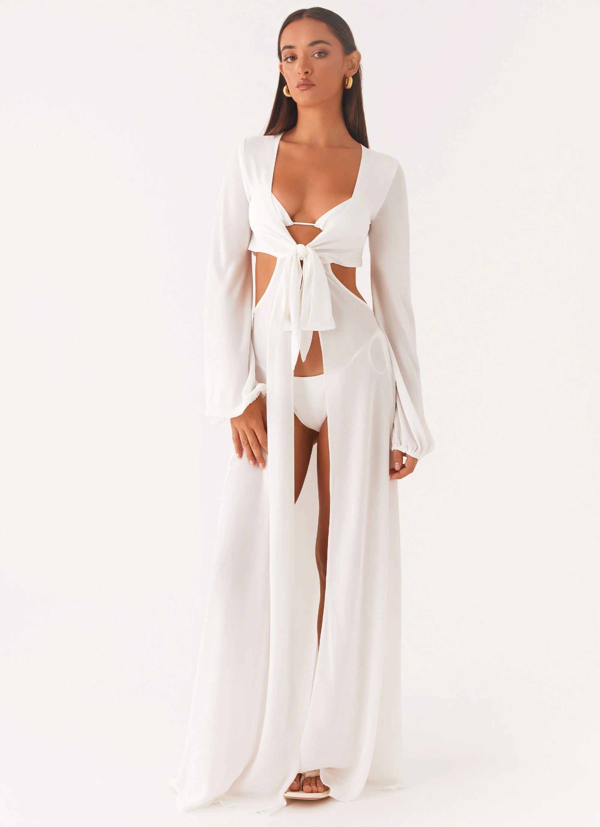 The Coastal Maxi Dress is a relaxed yet elegant piece. Featuring a low front neckline, front tie detail, and semi-sheer fabric, it’s perfect for those sun-soaked days and balmy nights when you want to shine effortlessly.