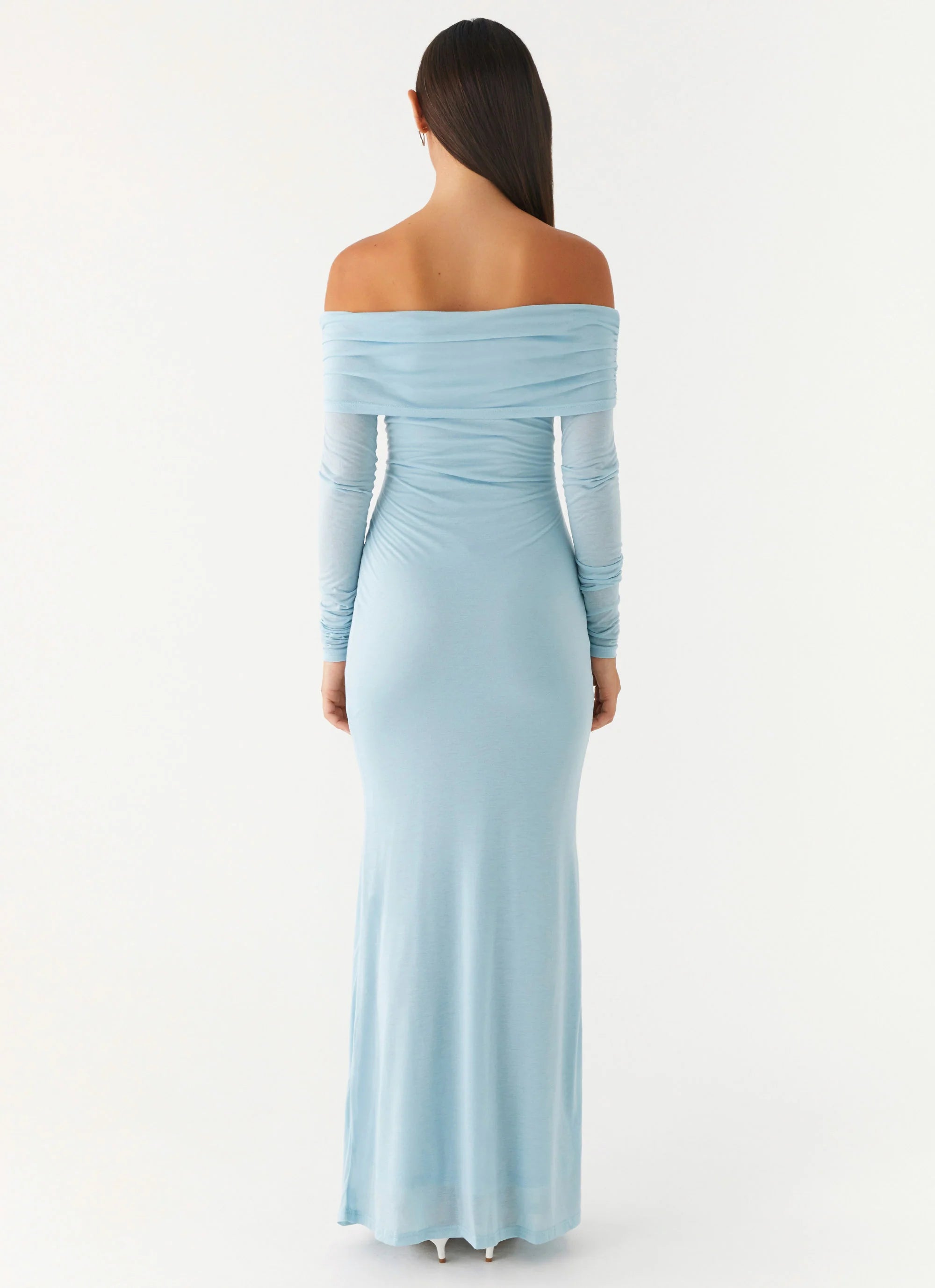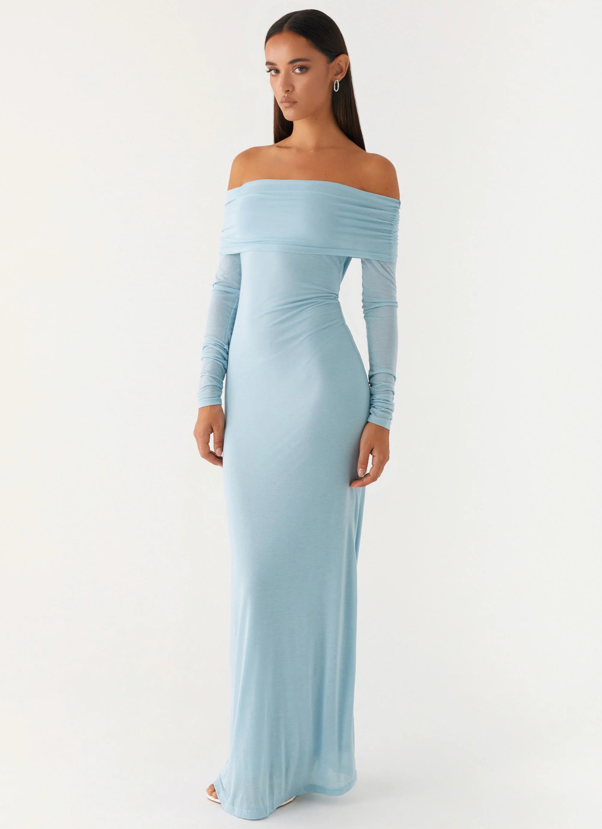 The Cocoa Long Sleeve Maxi Dress is a vision of after-dark allure. Featuring an off-shoulder neckline and ruched shoulder seams, it drapes flawlessly for a sultry silhouette. Its bodycon fit hugs every curve—made for golden skies and unforgettable nights.