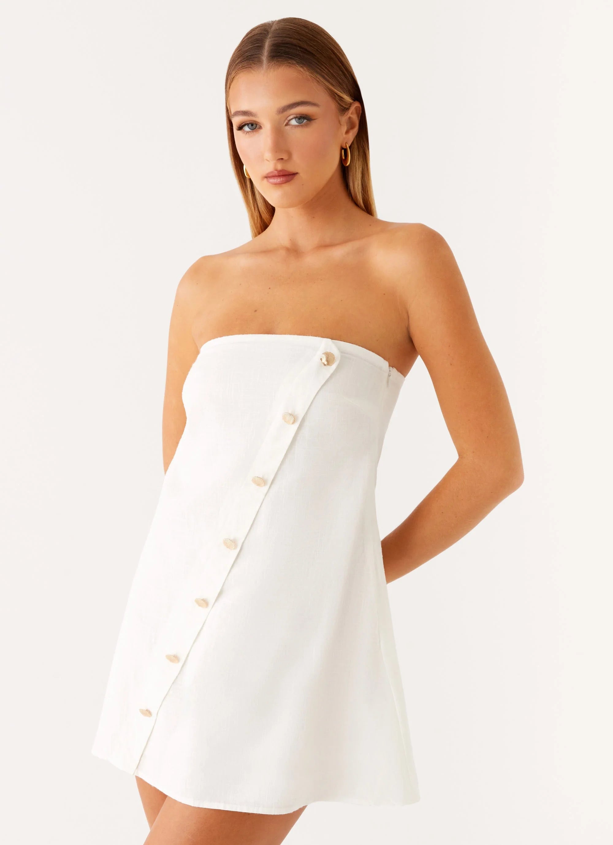 Simple yet striking, the Hazel Mini Dress is designed with a strapless neckline, faux button front, and a loose silhouette. Gripper tape and a back buckle detail ensure it stays perfectly in place while keeping you effortlessly chic.