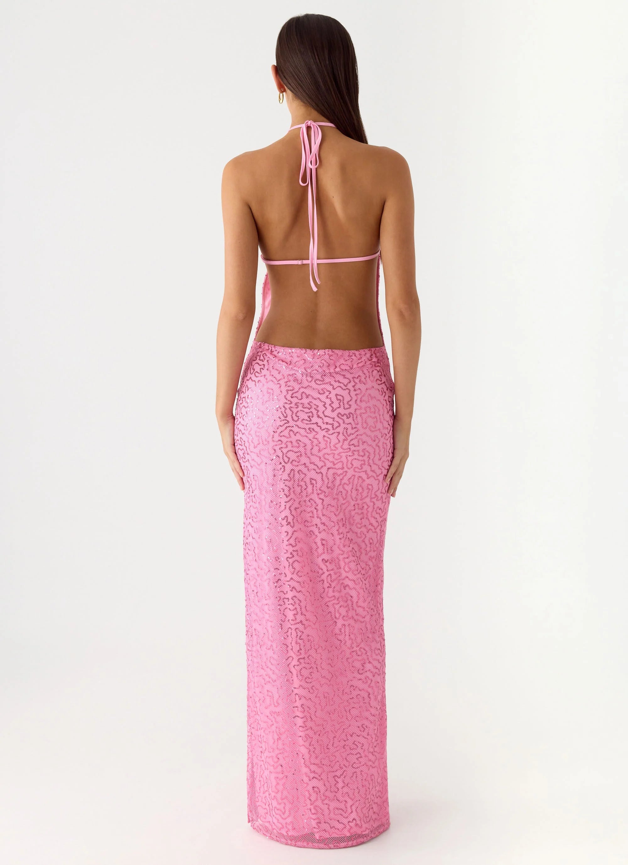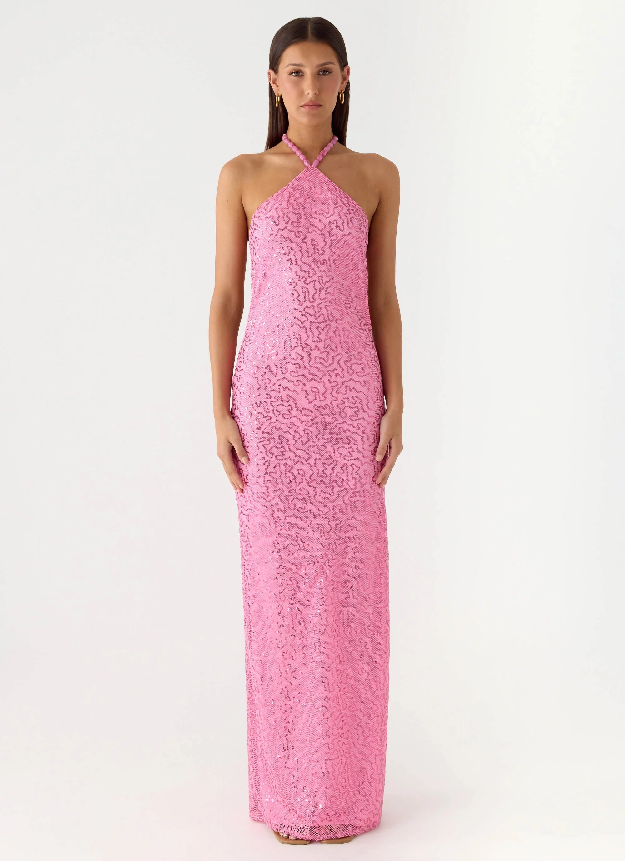 The Lorenz Sequins Maxi Dress is made for golden hour sparkle and after-dark statement style. Featuring a halter neckline with front stone beading and an adjustable back strap, this fully lined maxi silhouette is crafted in stretch sequin fabric for a body-fitting, glamorous look. Perfect for sunset-to-sundown evenings.