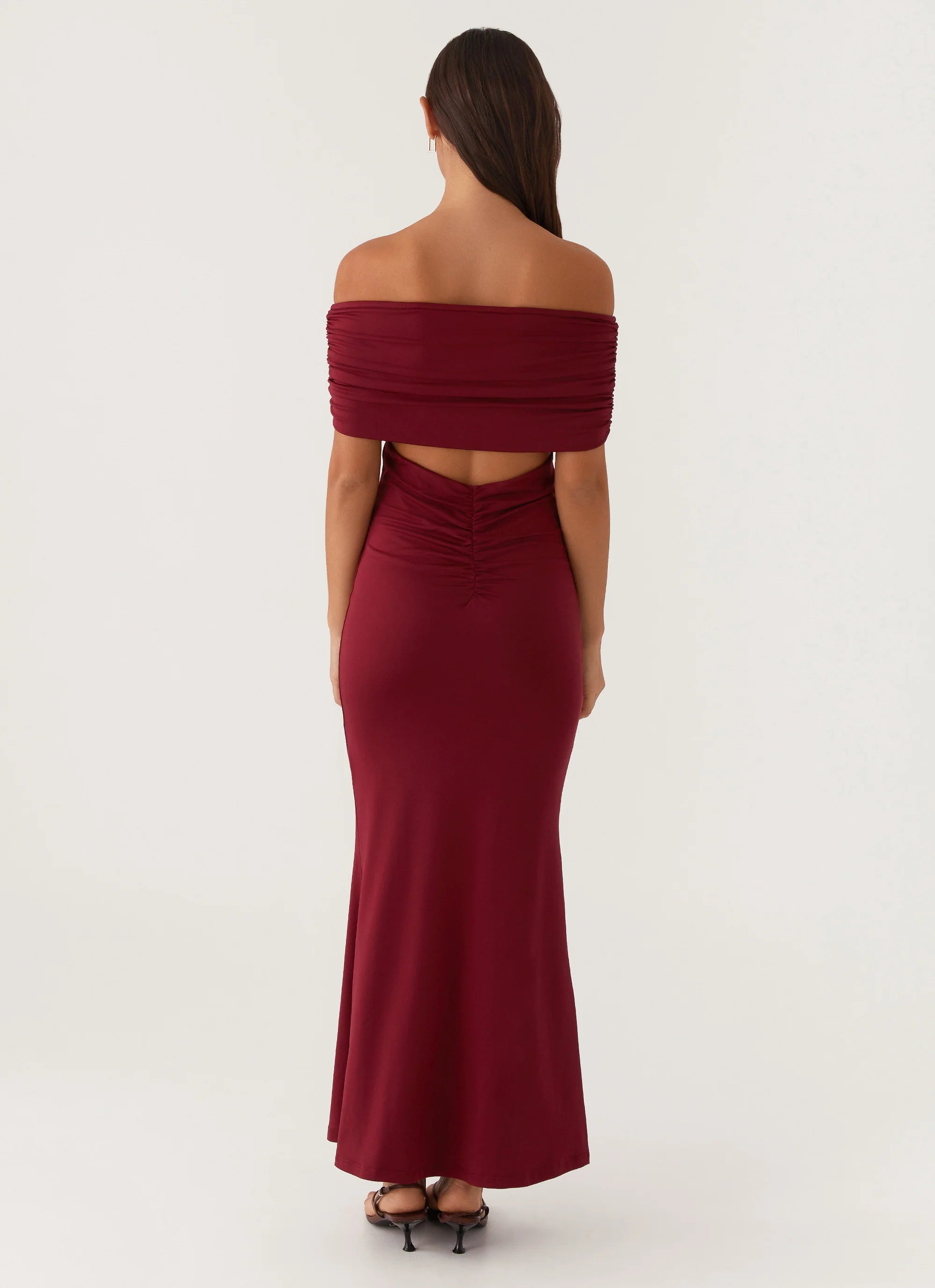 The Maude Maxi Dress features an off-shoulder neckline, bodycon fit, and stretch jersey fabric that hugs your curves. Perfect for a chic, figure-flattering look.