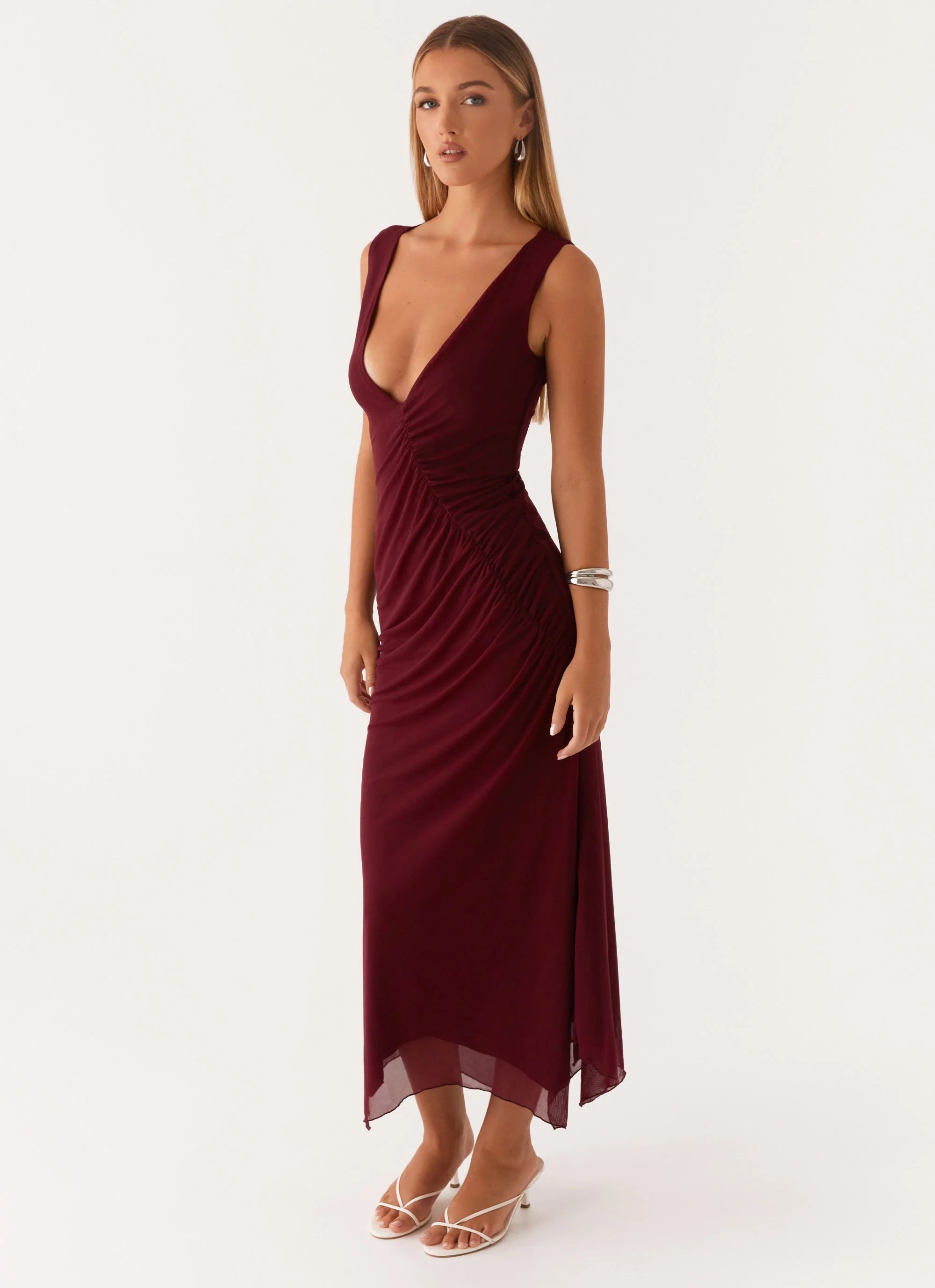 The Murphy Maxi Dress is a captivating and sophisticated piece, designed to make a statement. Crafted from mesh fabric, it offers a lightweight, breathable feel with a hint of allure. The deep V neckline adds a touch of boldness, while the ruched detail on the front creates flattering texture and movement.