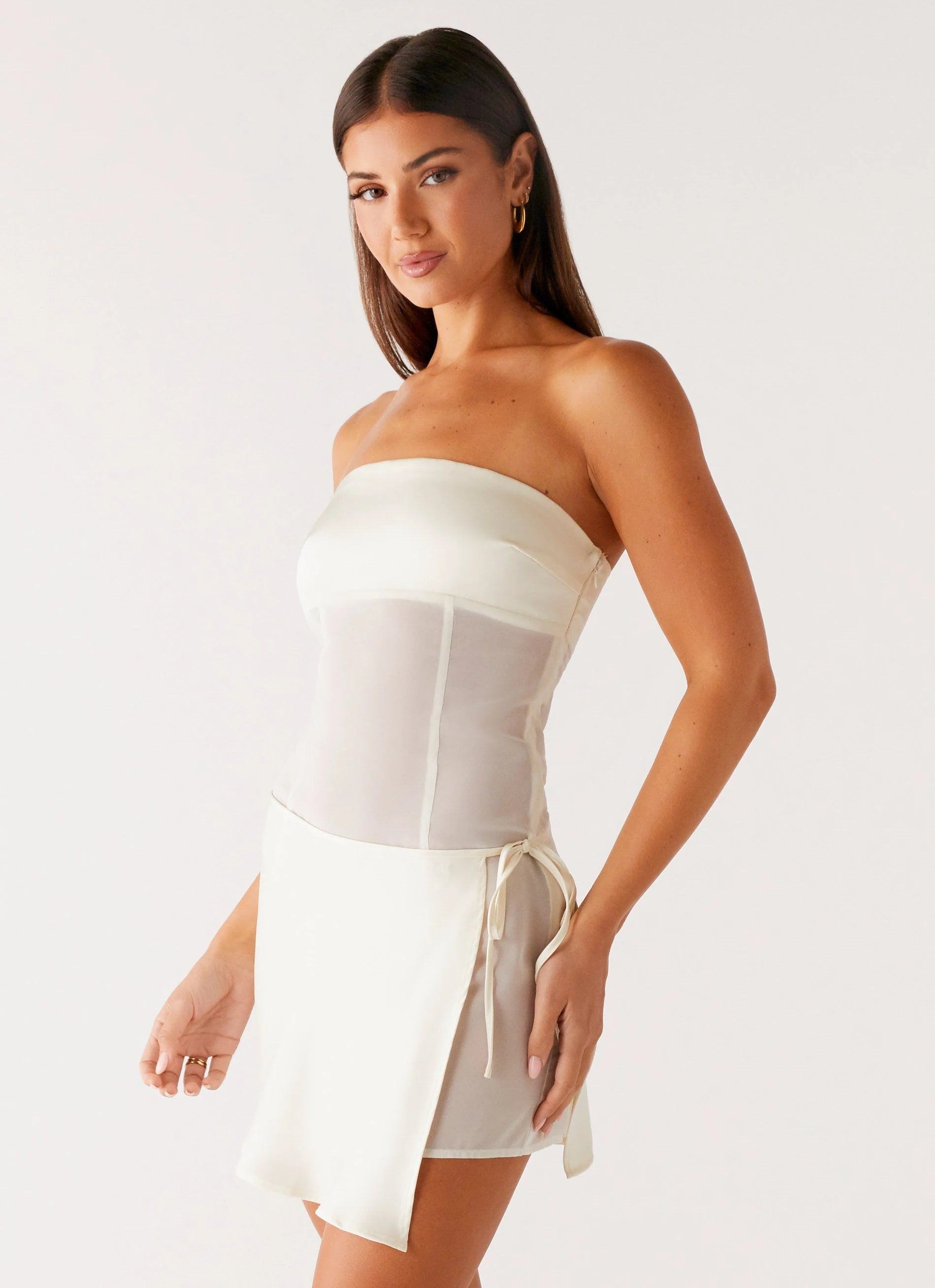 The Philomena Mini Dress in off white is made for golden hour entrances. Featuring a strapless neckline and a sheer body that hints at allure, it’s elevated with a tie waist panel that cinches you just right. This mini radiates effortless confidence—perfect from sunset to sundown.