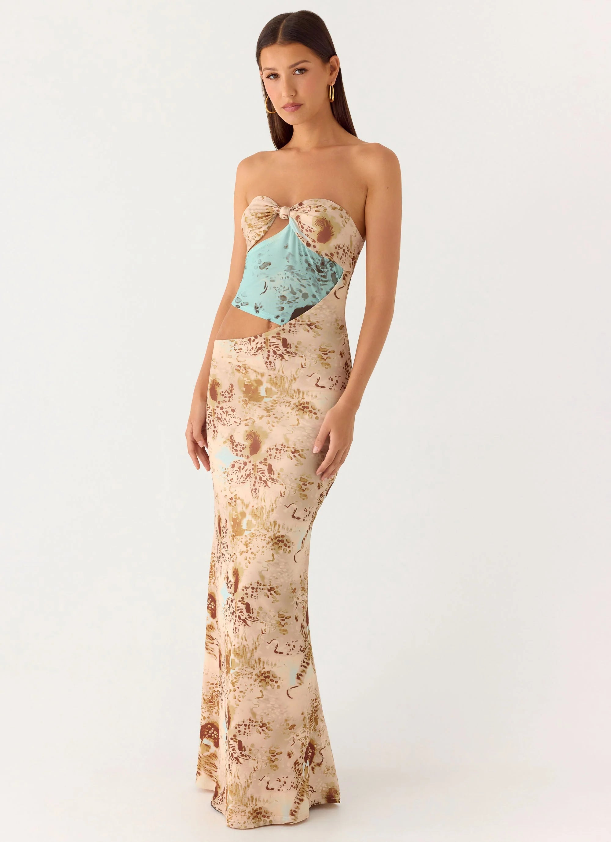 The React Strapless Maxi Dress is a stunning maxi dress designed with a strapless neckline, stretch mesh, and an asymmetrical waist. Fully lined with gripper tape for secure wear, it features an exclusive print, perfect for standout occasions.